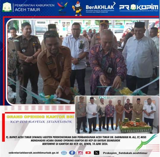Pj. Bupati Aceh Timur yang diwakili oleh Asisten Perekonomian dan Pembangunan Setdakab. Aceh Timur (DR. Darmawan M. Ali, ST, MISD) menghadiri acara Grand Opening Kantor BSI KCP Idi Rayeuk bertempat di Kantor BSI KCP IDI (Senin, 10-06-2024).